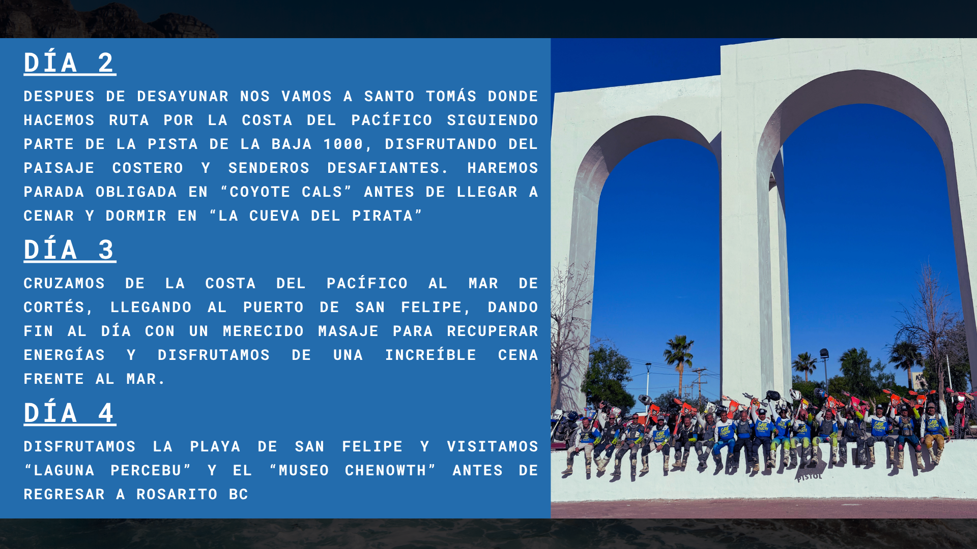 ¡Prepárate para el tour off-road todo incluido definitivo de 4 días por el norte de Baja California! Cruza de costa a costa recorriendo algunos de los caminos off-road más emocionantes e icónicos que existen. Aquí tienes un resumen del itinerario. Para recibir un itinerario más detallado o si tienes dudas adicionales, no dudes en contactarnos y alguien de nuestro equipo se pondrá en contacto contigo.